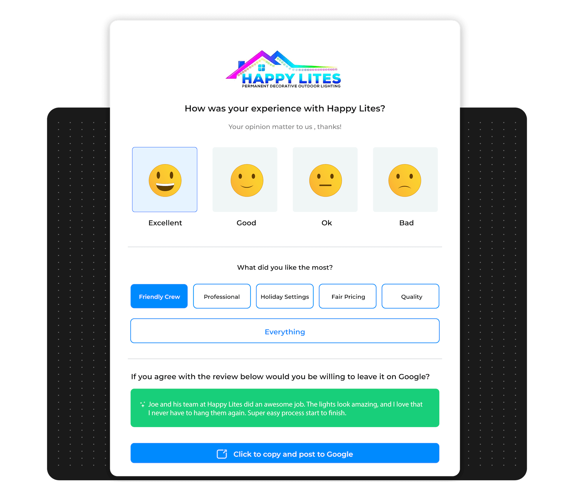 Bonfire directs happy customers to Google and sends unhappy ones to a private feedback form to give you a chance to make it right.